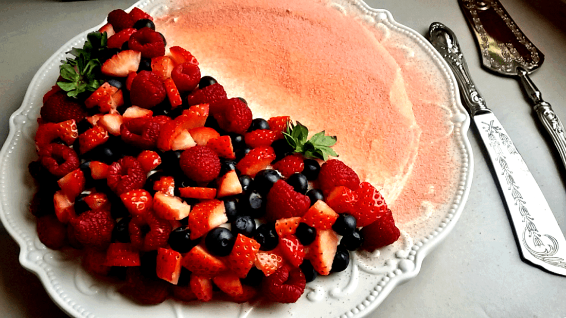 Spolvera metà torta col Pan di Spagna rosa polverizzato. Decora l’altra metà disponendo i frutti rossi precedentemente lavati e ben asciugati (sennò smonti la panna)