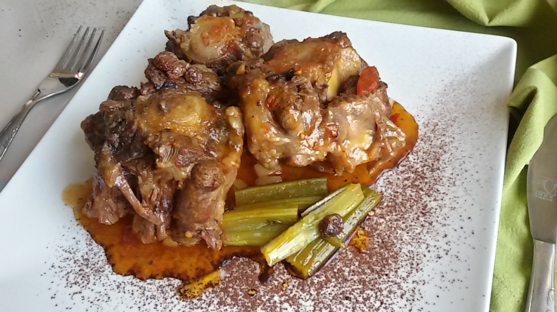 A questo punto, unisci i pinoli e l’uvetta e continua a cuocere senza il coperchio per 15 min. o comunque finché la carne si staccherà dall’osso. Spegni e spolvera il sugo di cacao amaro.