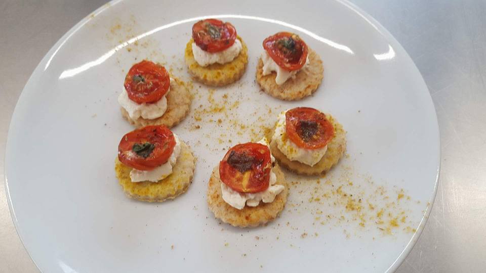 Quando i biscotti saranno freddi, spalmateli con un po’ di crema al tofu o di maionese e decorateli con un pomodorino confit.