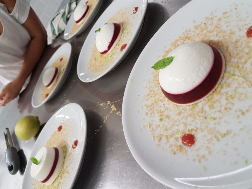 Allora, eccomi qua! Gli chef partecipano spesso ad eventi OFF che mirano alla costruzione di reti di professionisti e tra professionisti e territorio. Domenica sera pure io – che son petit chef – OFFatto 😛 un evento OFF, organizzato dalla Genius Food Academy di Bologna. 13 ospiti invitati ad assaggiare e valutare 4 portate. Io mi sono occupata dell’antipasto insieme a Fabrizio e del dessert. Come dessert ho presentato una bavarese allo yogurt con gelée di lamponi su granella di mandorle e con salsa di fragole, un dolce al cucchiaio che mi sembra adatto alla ristorazione. Ecco le dosi e un esempio di impiattamento…