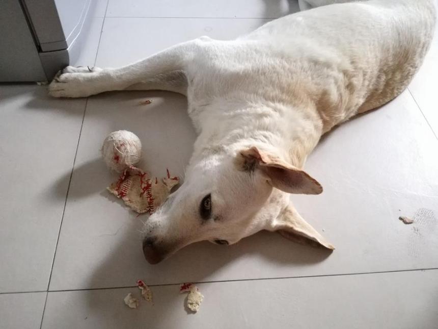 Qui c’è la Sofia che, sempre per il fatto di non avere il pollice opponibile, non mi ha potuto aiutare a impastare, quindi si è annoiata un bel po’, quindi ha DOVUTO distruggere la pallina da baseball che le avevo regalato. Avanti la prossima…