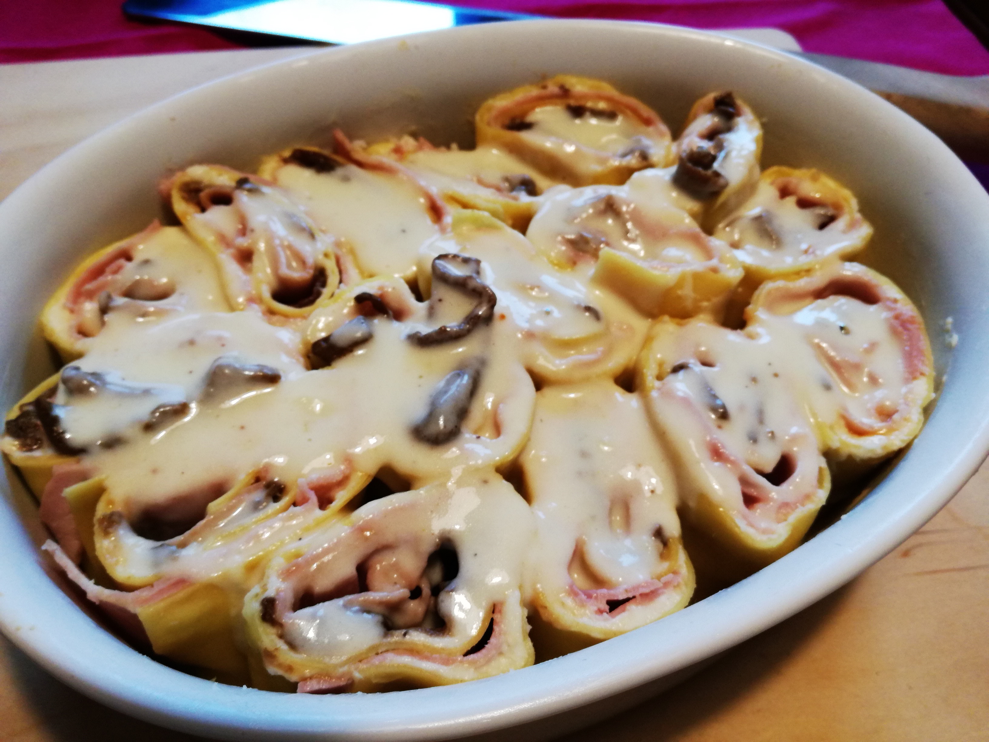 Prendete un rettangolo di pasta e rivestitelo con uno strato di crema al parmigiano-reggiano, una spolverata di noce moscata, se vi piace, un cucchiaio abbondante di funghi porcini e due fette di prosciutto cotto. Arrotolate il rettangolo delicatamente partendo dal lato corto e tagliate il rotolo in fette alte 4 cm.