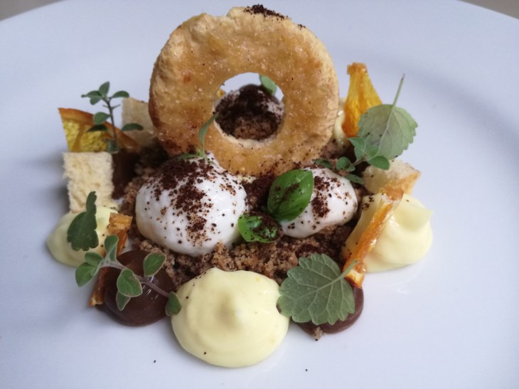 8) Impiattamento – Comporre il piatto, alternando spuntoni di crema allo stracchino, spuma al caprino, salsa di caffè, crumble al caffè, cialde, dadini e arance caramellate. Decorare con piccole foglie verdi edibili. Io ho usato foglie di melissa, timo e basilico che ho sul balcone. Spolverare col caffè.