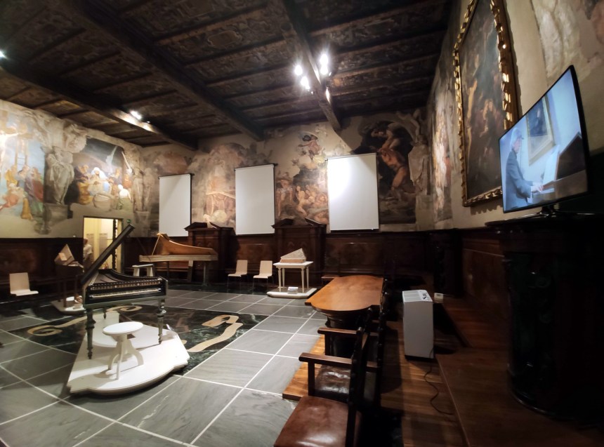 La volta, invece, fu realizzata alla fine del XVIII secolo da Innocenzo Flaminio Minozzi, un famoso quadraturista bolognese, specializzato in pittura murale a prospettive.