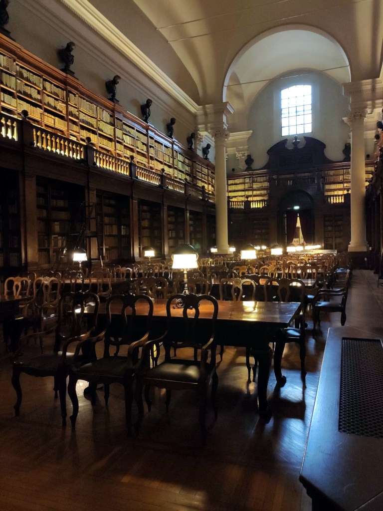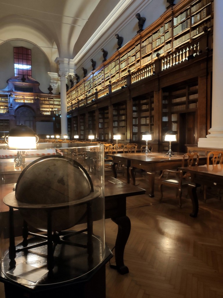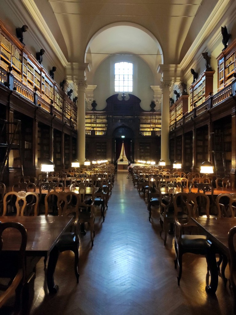 Inizialmente la sala era priva di tavoli e gli studiosi si appoggiavano ai piani di studio sporgenti. I tavoli vennero aggiunti solo dopo il 1803 quando in Aula Magna si tennero le lezioni universitarie.