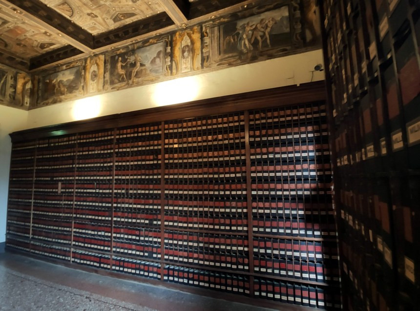 I libri erano spesso in doppia fila, riposti in vani nascosti, ad esempio nei basamenti delle colonne decorative in legno o nelle scale di accesso al ballatoio superiore.