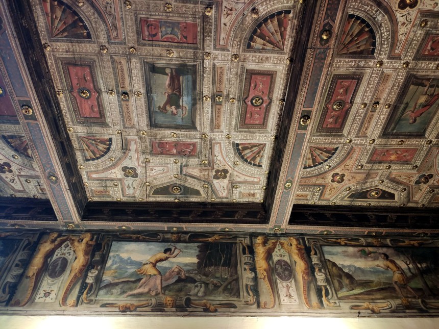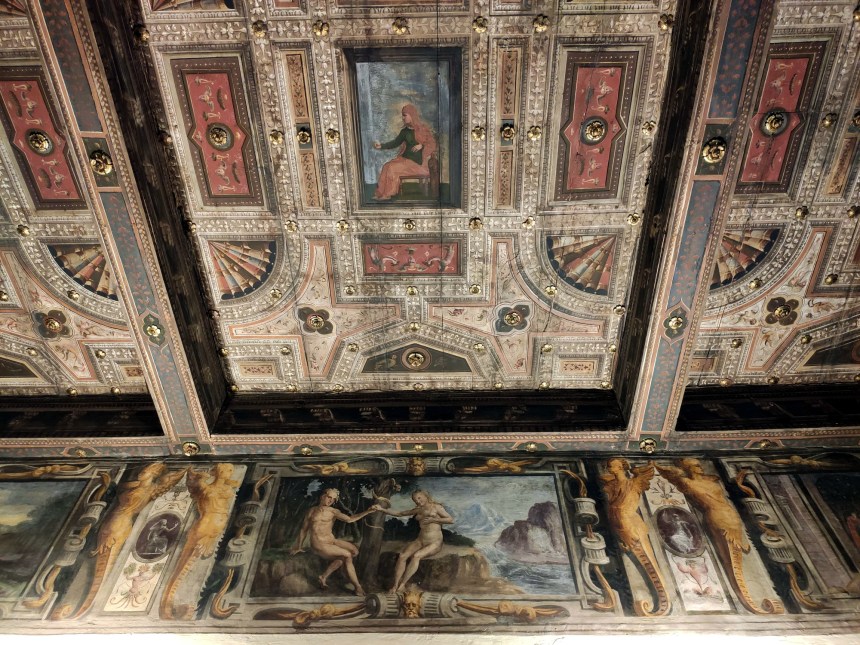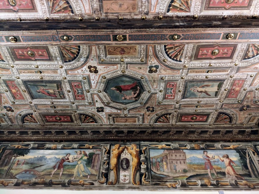 Di fianco all’Aula Magna c’è la sala Caronti che conserva il soffitto e gli affreschi originali del Cinquecento. Come si conveniva alla dimora di un Cardinale, si tratta di storie tratte dall’Antico Testamento, in particolare dalla Genesi.