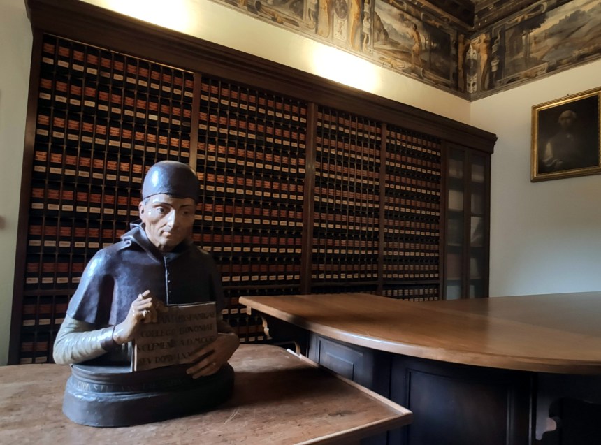 I busti non hanno solo scopo ornamentale ma servivano agli studiosi per orientarsi tra le librerie. A sinistra si trovano i testi religiosi, a destra quelli scientifici.