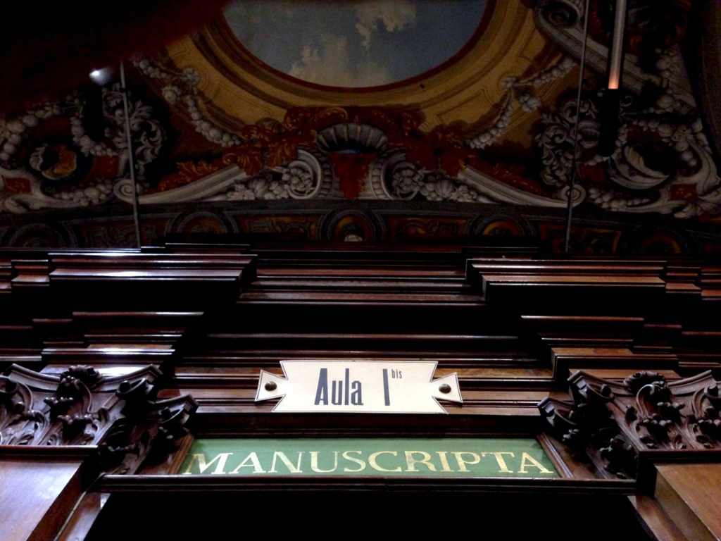 L’Aula Magna è la grande libreria voluta da Papa Benedetto XIV per conservare e mettere a disposizione i volumi che aveva donato alla BUB. Le dimensioni sono davvero notevoli e l’opera architettonica valse a Benedetto XIV l’appellativo di AMPLIFICATOR MAXIMUS (il grandissimo ingranditore), inciso sull’architrave di ingresso.