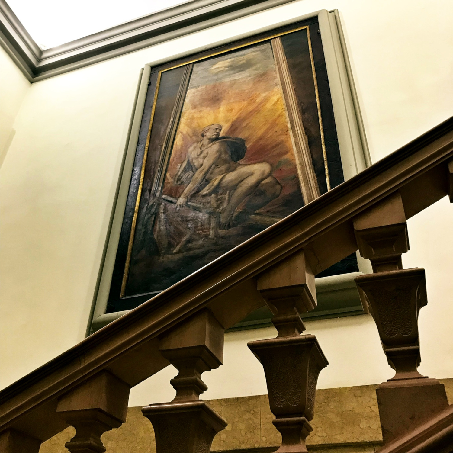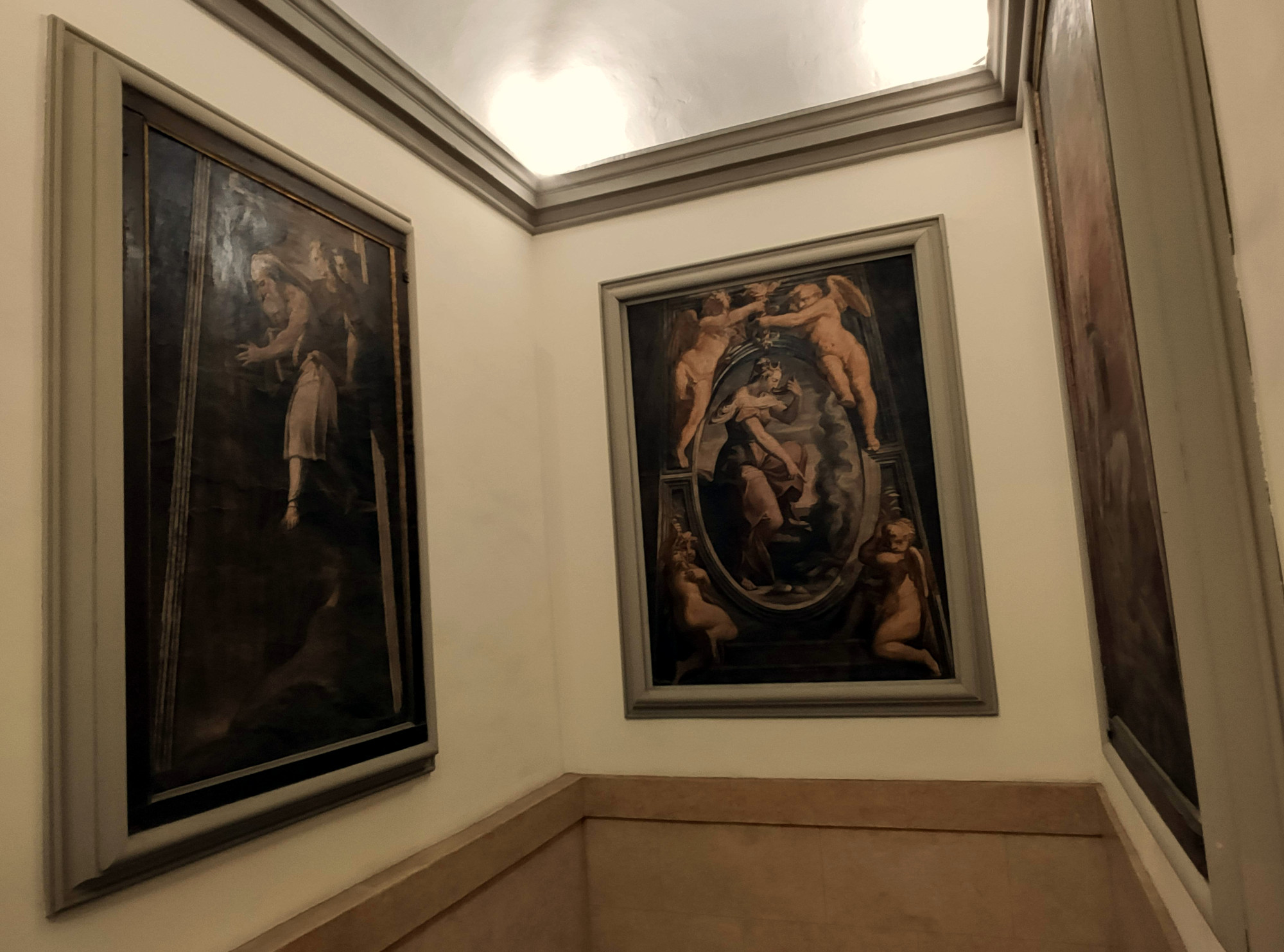 Lo scalone è abbellito con tre affreschi cinquecenteschi che si trovavano sui camini delle stanze di Palazzo Poggi, attribuiti a Pellegrino Tibaldi e Nicolò dell’Abate.