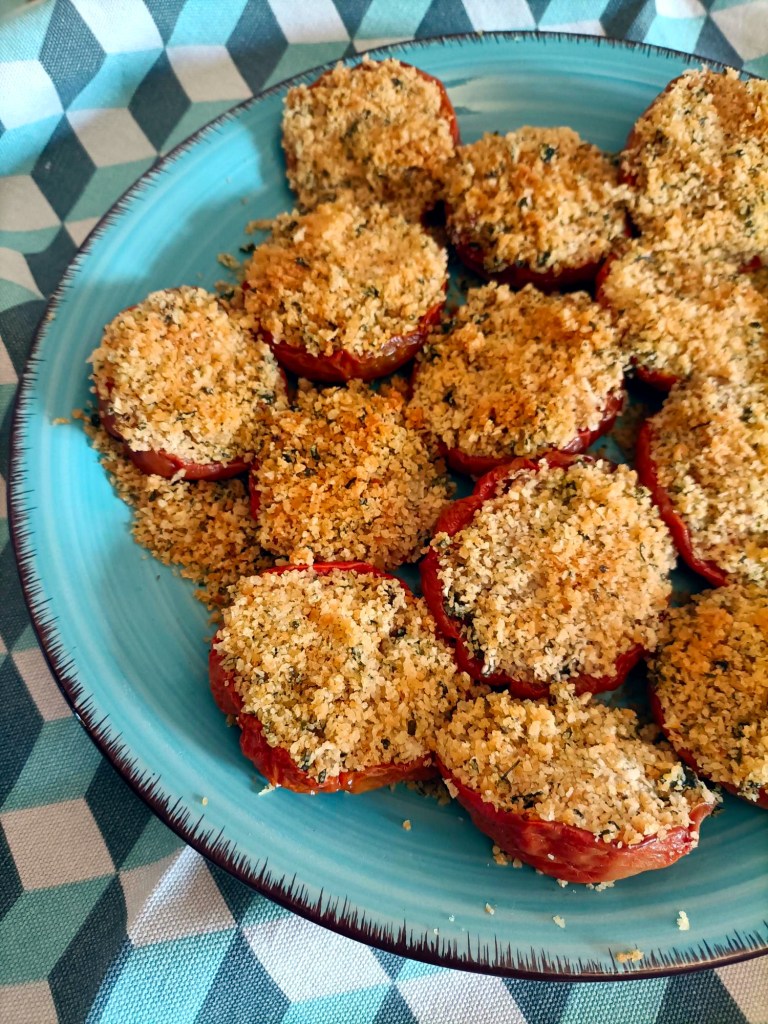 La ricetta di mia nonna era semplicissima: pomodori maturi, prezzemolo tritato, aglio, sale e pepe, olio e pane grattugiato. La base proprio.