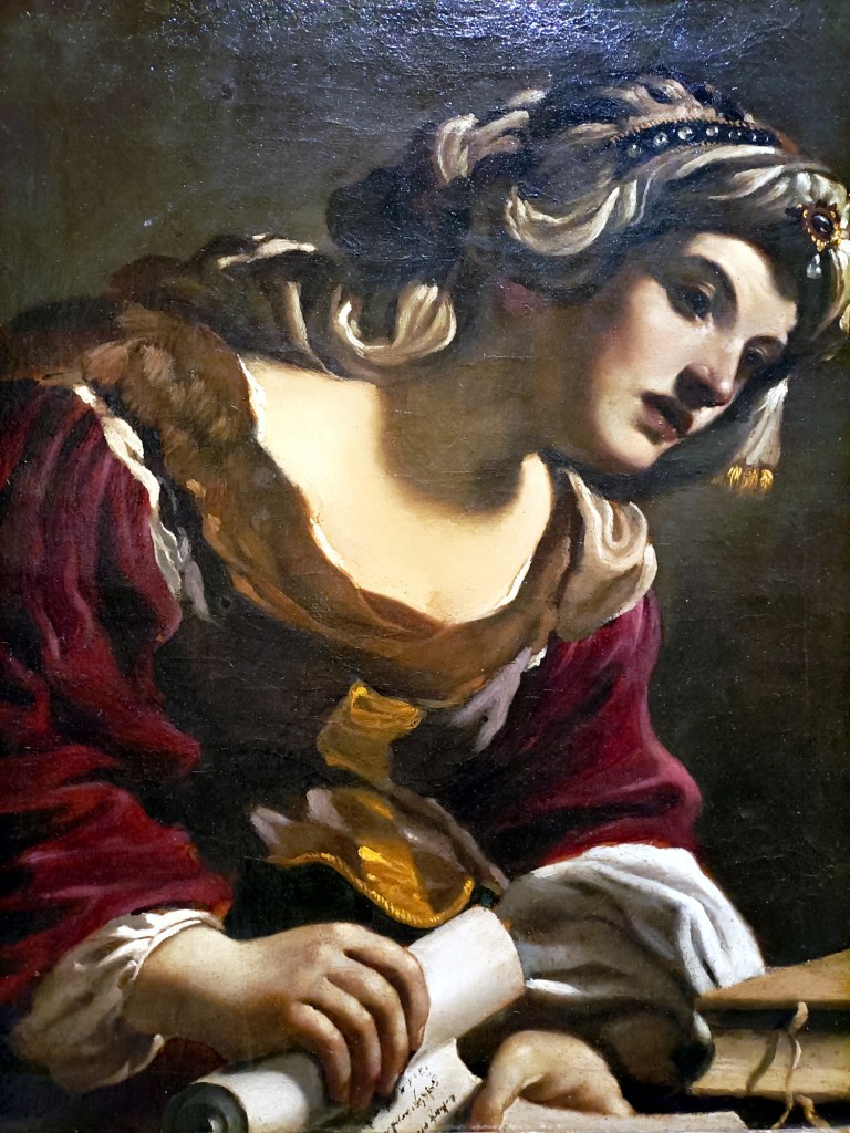 La Sibilla che vedete è opera del cosiddetto “periodo di transizione” del pittore, quello successivo al suo soggiorno romano (1621- 1623) e all’avvicinamento ai teorici del classicismo. Anche questa Sibilla è ornata da gioielli e da un turbante di gusto esotico, ma in questa versione sembra che Guercino abbia voluto sottolineare la bellezza morbida e naturale della donna, con la luce che le inonda il collo tornito e il petto.