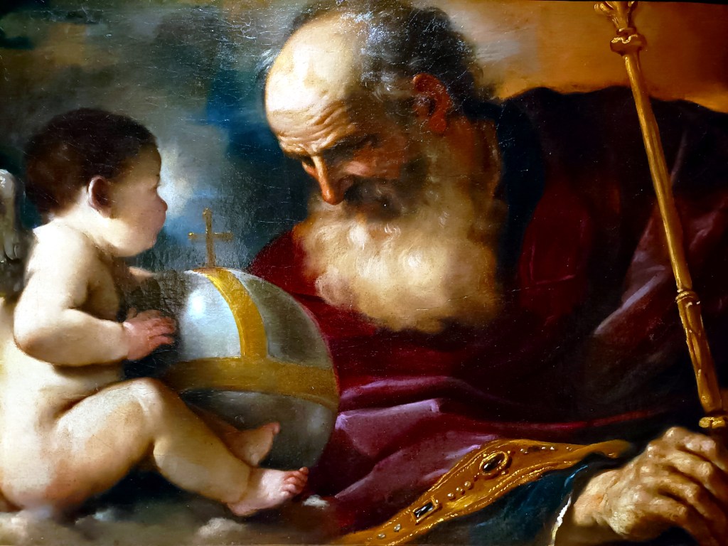 Ho guardato più volte il puttino e il bambino e la sensazione è stata quella di sentire l’odore di latte, talco e shampoo, il sudaticcio delle manine appiccicose, la gommosità delle guance, il respiro tiepido. Sono due quadri quasi intimi, dove i piccoli esprimono stupore e attenzione e la Madonna e Dio grandissima tenerezza.