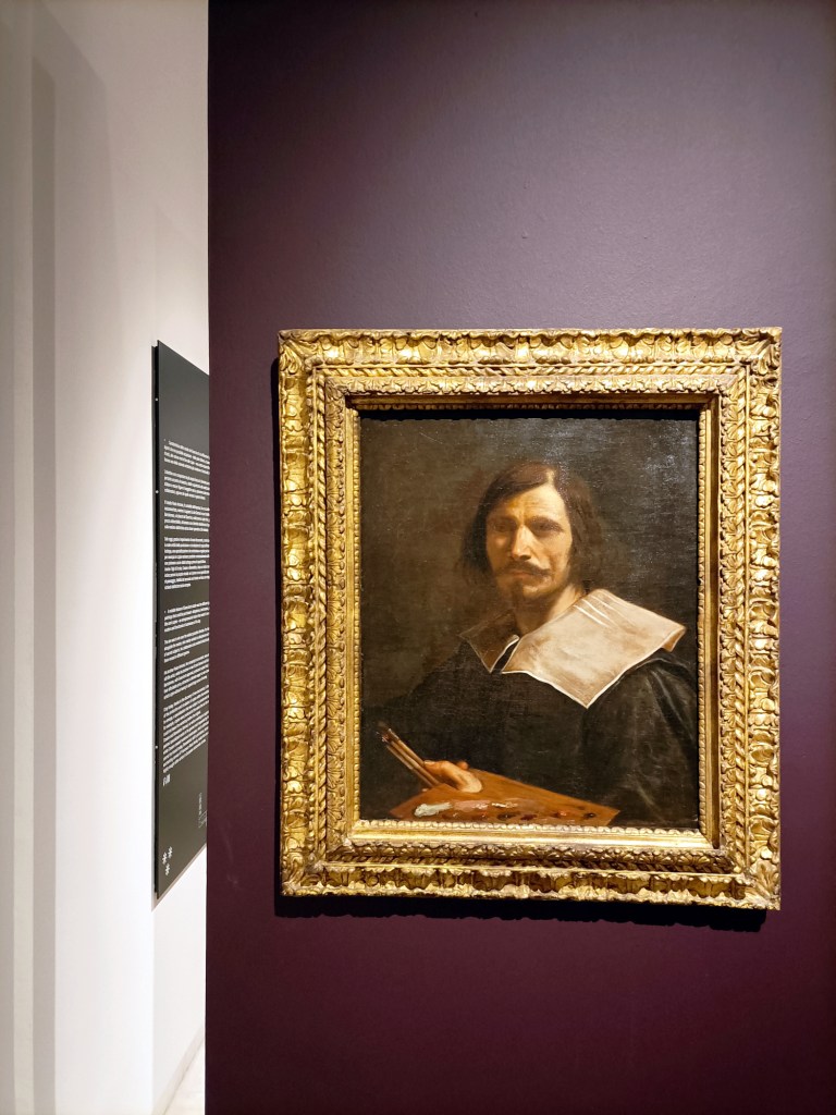 Guercino si rappresenta in modo naturale con l’evidente difetto di vista da cui derivò il suo soprannome, e allo stesso tempo l’eleganza dell’abito e la solennità della posa mostrano il successo ormai raggiunto.