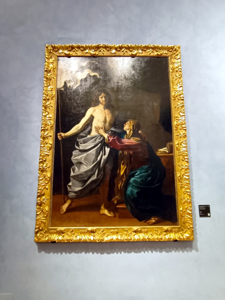 L’altro è Cristo risorto appare alla madre in cui troviamo Cristo e la Madre in un altro momento di intimità domestica. Non siamo più al cospetto del Bambin Gesù ma del Cristo Risorto, composto e vincitore della morte, che ritorna dalla Madre che sta leggendo. Il ritorno la riempie di commozione: la madre lo tocca con tenerezza e delicatezza e piange, come dire “Ma sei proprio tu, allora è vero che ce l’hai fatta!” e l’incontro tra i due assume una teatralità toccante.